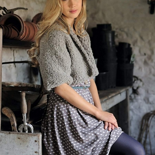 Originally designed for The Knitter magazine, this stylish mushroom-coloured, handknitted, cropped jacket in chunky boucle has a shawl collar and no front fastening – but would look good fastened with a brooch or pin. Ideal for wearing over a jumper or light jacket for extra warmth.